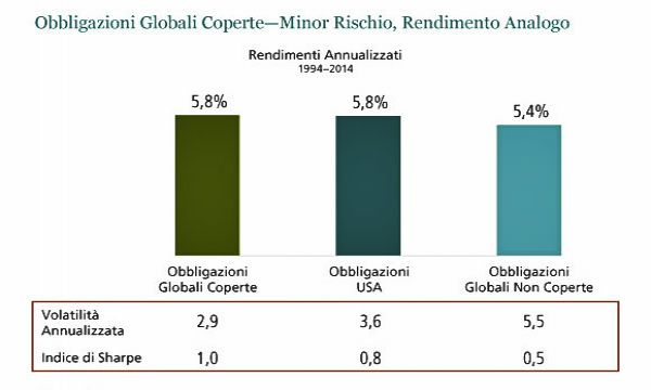 L'indice Barclays Global Aggregate Bond (senza copertura) nel 2014 ha ottenuto un misero rendimento dello 0,6% se paragonato all'eccezionale 7,6% ottenuto dall'indice Barclays Global Aggregate Bond (con copertura USD). La differenza sta nella copertura valutaria: eliminare l'esposizione valutaria altamente volatile dai portafogli obbligazionari a basso rischio può aiutare a superare periodi difficili come il 2014, in cui il dollaro americano è stato tra le valute più forti del mondo. Le dinamiche valutarie tendono a durare qualche anno, quindi non stupiamoci se la storia si ripeterà nel 2015.