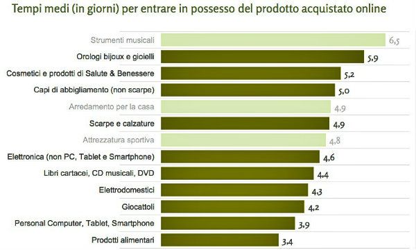 I tempi di consegna risultano leggermente superiori ai tempi di ritiro: chi opta per il ritiro entra in possesso del bene acquistato 4,3 giorni dopo la data dell'ordine (4,6 per la consegna). ?Le consegne "same day" o quasi (entro le 24 ore) riguardano l'8% degli acquisti ritirati e solo l'1% degli acquisti consegnati.?Nel caso del servizio di ritiro, l'avviso di consegna avviene prevalentemente via mail (7 casi su 10) o via SMS. Nel caso del servizio di consegna invece, l'avviso avviene utilizzando più canali: prevalentemente via mail (circa 5 casi su 10) ma anche tramite interrogazione di un servizio online, tramite una telefonata o via SMS.