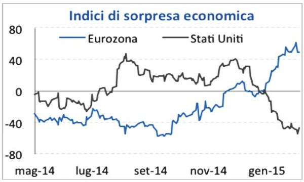 Il contesto generale migliora. Per la prima volta da 3 anni si assiste a una revisione verso l'alto dei PIL in Europa. I mercati si inquadrano ancora in una dinamica di sorpresa positiva, come sta a indicare l'indice di sorpresa economica pubblicato da Citigroup. Il forte irripidimento indica che gli operatori da due mesi ormai "rincorrono il mercato".