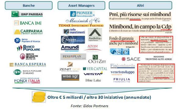 Gli strumenti di finanziamento alternativi, quali minibond e cambiali finanziarie, cominciano a rappresentare un'importante leva a cui le piccole e medie imprese (PMI) possono ricorrere grazie all'evoluzione normativa degli ultimi anni. La ricerca sul mercato italiano dei minibond, realizzata da Eidos Partners e Bureau van Dijk e pubblicata lo scorso febbraio, ha evidenziato un mercato in forte crescita a partire dalla seconda metà del 2014. Lo studio, i cui dettagli sono disponibili sul sito PiattaformaPMI ( www.piattaformapmi.it ), ha messo in luce le principali caratteristiche qualitative e quantitative delle società che ricorrono a questi strumenti alternativi di finanziamento. Se si osserva il mercato dal lato della domanda, la platea di fondi di investimento dedicati ai minibond, anche detti fondi di "private debt", ha visto negli ultimi anni un notevole sviluppo sebbene siano un soggetto relativamente nuovo per il contesto italiano. Ad oggi, in Italia risultano annunciate (ed in alcuni casi già operative) oltre 30 iniziative di fondi di minibond. La raccolta target dei fondi varia fra 100 milioni e 500 milioni. Se si sommano i valori di tutte le iniziative, si arriva ad un'offerta potenziale compresa tra i 5 e i 6 miliardi di euro, una cifra davvero importante soprattutto se si osserva che, ad oggi, il controvalore totale delle emissioni di minibond è inferiore ad 1 miliardo. Questo lascia ampi margini di crescita per il mercato delle obbligazioni emesse delle PMI italiane.