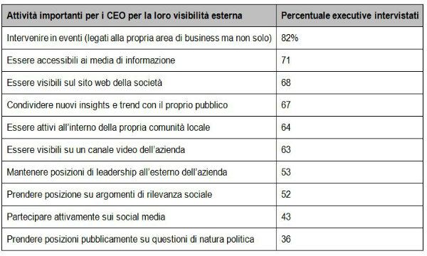 C'è una forte correlazione fra reputazione e attività di relazioni esterne. Ai CEO che godono di grande ammirazione è attribuita maggiormente la capacità di conquistare il proprio pubblico, diversamente dai CEO meno ammirati (rispettivamente il 50% contro il 13%). E' stata posta questa domanda: quali fra le tante piattaforme a disposizione oggi sono più strategiche per i CEO in considerazione del fatto che il loro tempo è limitato e che essi hanno una chiara predisposizione avversa al rischio? A questa domanda la maggioranza degli executive a livello globale (82%) ha affermato che il public speaking è la modalità di engagement più efficace per i CEO nei confronti di stakeholder esterni. Ci sono però molte altre importanti responsabilità per i CEO sul fronte esterno, come si evince dalla tabella.