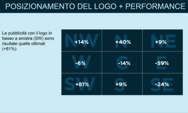 - gli annunci con un logo in basso a sinistra dello spazio pubblicitario (rispetto a qualsiasi altro posizionamento) raggiungono in media un tasso di conversione maggiore dell'81%.