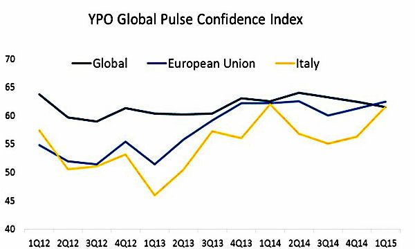 La fiducia è tornata finalmente a crescere in Italia nel primo trimestre del 2015, sia grazie alla discesa dei prezzi delle commodity sia grazie alle ultime misure della Banca Centrale Europea con i pacchetti di quantitative easing. Il Global Pulse Confidence Index, l'indagine trimestrale di YPO che misura la fiducia dei CEO nel business e nell'economia, è salito nel nostro Paese nell'ultimo trimestre di ben 5,3 punti raggiungendo quota 61,6, il livello più alto dell'ultimo anno.
