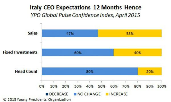 "Il risultato indica che le positive politiche economiche, il basso costo del petrolio e la continua svalutazione dell'euro finalmente offrono ai manager, così come ai consumatori finali, una spinta consistente dopo un periodo estremamente sfidante", ha dichiarato Federico Grom, membro di YPO Italia. "Ovviamente i top manager restano cauti e vigilanti sulle previsioni dei prossimi 12 mesi, consapevoli delle numerose minacce, sia locali che esterne, che potrebbero compromettere la crescita economica".