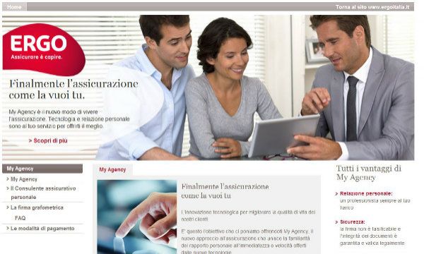 Lo sanno bene i consulenti assicurativi personali della rete di ERGO, fiore all'occhiello in Italia per aver adottato un processo di vendita totalmente paperless. Il tutto grazie a MyAgency, l'agenzia digitale che viaggia direttamente in un tablet, rendendo il consulente assicurativo, per la prima volta, davvero su misura per ogni cliente. Uno strumento rivoluzionario, premiato recentemente ai Mega Trends 4 Financial Services 2015, l'appuntamento internazionale di riferimento per il mondo Banking & Finance, come miglior esempio di eccellenza operativa nella categoria New Customer Engagement in Assicurazione, per un modello di business nuovo e unico in quanto a immediatezza e capacità di generare risultati.