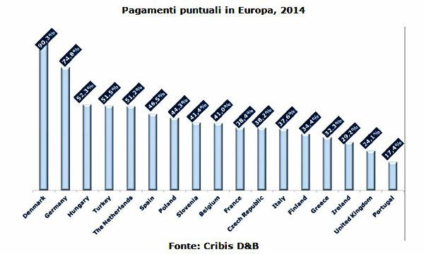L'Italia appare in linea con la media continentale, con il 37,6% di buoni pagatori, seguita da Finlandia, Grecia ed Irlanda che presentano maggiori difficoltà nel rispettare i termini concordati. Le performance peggiori sono del Regno Unito, con solo il 24,1% di imprese puntuali, e del Portogallo, con il 17,4%.