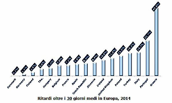 In questo scenario, l'Italia si colloca in una posizione intermedia rispetto agli altri Paesi europei, grazie ad una percentuale di pagatori puntuali del 37,6%, presentando però un allarme sulla situazione dei ritardi oltre i 30 giorni medi, ben il 15,7%, per cui si colloca nelle ultime posizioni del ranking europeo.