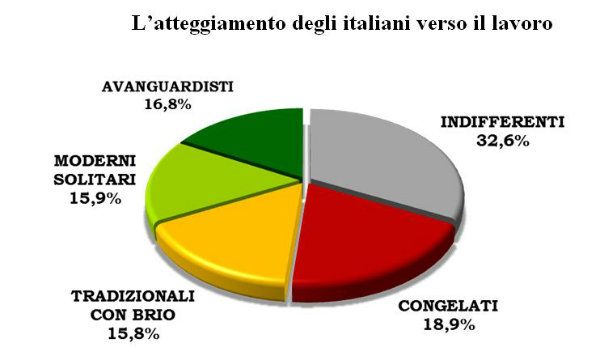 Dallindagine esce un'Italia divisa in cinque tipi, proprio rispetto al tipo di lavoro - orario, posto, modalità, competenze, retribuzione ecc. fisse o meno - che a loro piace e confà. Metà ancora ancorata al lavoro vecchio stampo dove tutto è fisso e dove si pensa il posto sia garantito quasi per legge, sono quegli italiani che rispetto al lavoro abbiamo chiamato Indifferenti (32,6%) e Congelati (18,9%). Poi ci sono quelli con un piede nella tradizione e uno nella modernità che definiamo Tradizionali con brio (15,8%).