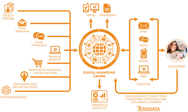 Teradata è quotata al NYSE, membro dei top 500 S&P con oltre 11mila dipendenti che opera nel segmento Tecnologie per le aziende: le aspettative di innovazione e crescita sono talmente forti che a volte anche gli ingenti investimenti nei nostri laboratori di ricerca & sviluppo non bastano. Infatti, Teradata nel corso degli ultimi anni ha realizzato una serie di acquisizioni mirate, selezionando tecnologie "best of breed" per specifici canali, integrandole tra loro per modellare la piattaforma tecnologica Digital Marketing Center. Questa consente di implementare la marketing automation nei canali sopra citati: email, sms, mobile push e social media.