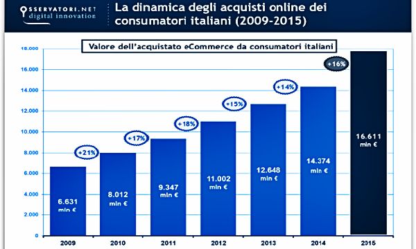 Prosegue la crescita dell'eCommerce in Italia: il valore degli acquisti online degli italiani raggiunge nel 2015 i 16,6 miliardi di euro con un incremento in valore del 16% rispetto al 2014 pari a oltre 2,2 miliardi di euro.