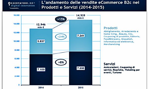 "Nel 2015 è importante anche l'apporto di Food&Grocery, Arredamento e Home living e Beauty che insieme contribuiscono alla crescita complessiva per quasi 200 milioni di euro. Gli acquirenti italiani acquistano online anche quelle categorie merceologiche, come alimentari o oggetti d'arredamento, fino a qualche tempo fa quasi assenti sul web. L'acquisto di cibi e bevande (vino compreso) rappresenta oggi il 3% circa delle vendite da siti italiani ed è uno dei settori più dinamici nel panorama dell'eCommerce B2c italiano".