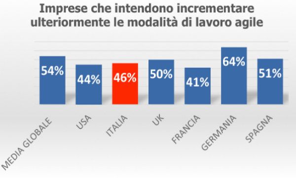 Anche un corretto bilanciamento tra lavoro e vita privata (worklife balance) è ritenuto necessario dal 58% degli imprenditori e manager italiani intervistati (media globale 61%) e la soluzione può venire dall'utilizzo di modalità di lavoro agile grazie alla possibilità di poter lavorare più vicino a casa, un'esigenza segnalata dal 45% degli intervistati in Italia (media globale 48%).