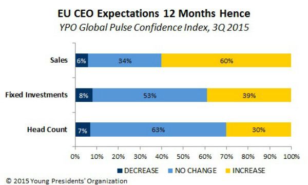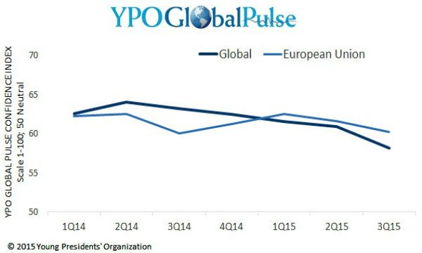 La fiducia dei CEO nell'UE è rimasta relativamente sostenuta nel terzo trimestre del 2015, con un maggiore ottimismo dei leader aziendali della regione rispetto alle controparti nel resto del mondo. L'Indice di fiducia YPO Global Pulse per l'UE, che valuta con frequenza trimestrale la fiducia dei CEO nella regione, ha indicato un livello costante di ottimismo che, attestatosi a quota 60,2, fa segnare solo un lieve calo rispetto al 61,6 dello scorso trimestre. YPO è l'acronimo di Young Presidents' Organization.
