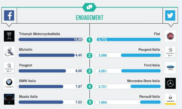 Le due classifiche di Facebook sono dominate dalle pagine ufficiali di diverse case automobilistiche. Per quanto riguarda il page engagement, ovvero lengagement pesato sul numero di fan, a trionfare è il brand di moto Triumph MotorcyclesItalia che genera un alto livello di interazioni grazie alla partnership con David Beckham e al lancio della nuova moto Bonneville. Segue in seconda posizione la pagina di Michelin che raggiunge lapice delle interazioni in concomitanza del Campionato del Mondo Rally (WCR) e al terzo posto Peugeot che genera unesplosione di interazioni grazie alla sponsorship di #XF9. Un altro brand che fa il pieno di engagement è Mazda Italia: il post più engaging in assoluto è quello relativo al Tokyo Motor Show durante il quale è stato presentato il nuovo modello Mazda RX-VISION.