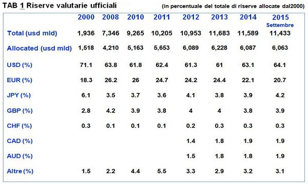 Quello che emerge dalla recente revisione è la significativa riduzione del peso della moneta unica sceso al 30,93% contro il precedente 37,4% e una limatura nelle percentuali dello Yen giapponese, dal 9,40% all'8,33% e della Sterlina inglese in calo all'8,09% dall'11,30%.