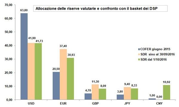 Tale evento, che comporta per il Renminbi l'acquisizione dello "status" di moneta di riserva internazionale, rappresenta il raggiungimento di uno degli obiettivi delle autorità monetarie e governative di Pechino. Il nuovo basket sarà costituito da cinque monete così rappresentate: Dollaro statunitense 41,73%, Euro 30,93%, Renminbi cinese 10,92%, Yen giapponese 8,33% e Sterlina inglese 8,09%. Il secondo grafico ci mostra la ripartizione e l'evoluzione del peso percentuale delle divise all'interno paniere del DSP.