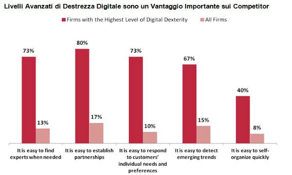 Il report rivela anche che livelli avanzati di destrezza digitale consentono alle aziende di cogliere le opportunità e rispondere ai cambiamenti in modo molto più rapido rispetto ai concorrenti tradizionali (vedi grafico).