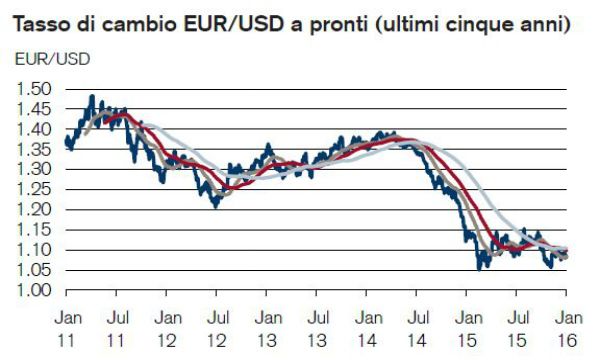 Tra le riunioni della Banca centrale europea (BCE) del 3 dicembre 2015 e del 21 gennaio 2016, alcuni mercati azionari europei sono calati di quasi il 17%. Ciononostante, in quest'occasione, la volatilità dei mercati non ha avuto origine dall'Europa. Continuiamo a favorire l'Eurozona rispetto ad altre regioni, soprattutto per via a) del supporto continuo del programma di quantitative easing della BCE e b) dell'economia europea sospinta dalle esportazioni: le esportazioni dell'Eurozona rappresentano il 26% del PIL (rispetto al 24% in Cina, al 19% in Giappone e al 13% negli USA). Prevediamo che l'indebolimento dell'EUR sosterrà la crescita complessiva delle esportazioni e la redditività delle aziende. Il cambio EUR/USD è calato del 30% circa dal marzo 2014 e del 14% su base trade weighted.