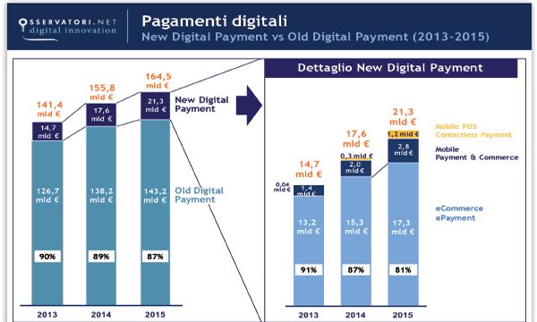 "Le stime per il 2015 vedono infatti i pagamenti via carta di credito raggiungere quota 164 miliardi di euro (+5,6%), una crescita sostenuta prevalentemente dai New Digital Payment che complessivamente raggiungono nel 2015 i 21 miliardi di euro (+22% rispetto al 2014). L'apporto decisivo viene proprio, per l'81%, dall'acquisto di beni e servizi e dai pagamenti da PC e tablet e per il 13% da acquisti e pagamenti via Smartphone, che registrano un balzo in avanti del 48% (2,8 miliardi di euro nel 2015). Occorre che i principali protagonisti dell'offerta attivino un sano confronto con il mercato per rendere più attraente l'esperienza d'uso per i clienti", ha aggiunto Valeria Portale, Direttore dell'Osservatorio Mobile Payment & Commerce.