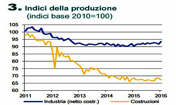 Indicazioni contrastanti giungono dalla produzione nelle costruzioni. Da un lato il dato di gennaio segna una flessione rispetto a dicembre 2015 (-1,5%), sebbene nella media degli ultimi tre mesi risulti in aumento di circa il 2%. Dall'altro, si susseguono segnali a supporto dell'ipotesi di una inversione ciclica: alla ripresa del numero di compravendite immobiliari in T3 hanno fatto seguito l'aumento degli investimenti in T4 (+0,9%) e l'attenuazione della caduta tendenziale dei prezzi delle abitazioni (-0,9% in T4 rispetto al -2,2% in T3). Infine, la fiducia delle imprese, seppure in lieve diminuzione rispetto al mese precedente, presenta a marzo un miglioramento delle attese sugli ordini.