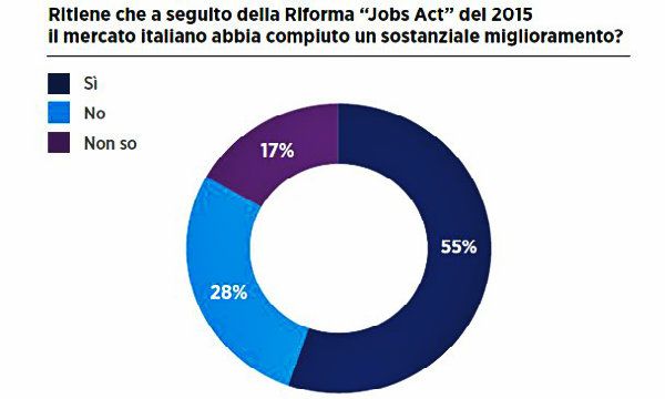 Per effetto della nuova Riforma del Lavoro, il 59% delle aziende italiane afferma di aver aumentato il numero dei lavoratori assunti a tempo indeterminato nel corso del 2015, contro il 36% delle aziende che non l'ha fatto. Secondo le imprese intervistate, la crescita nel volume delle assunzioni è favorita da tre novità introdotte dalla Riforma: l'esenzione contributiva introdotta dalla Legge di Stabilità (75%), il contratto a tutele crescenti (69%) e l'abolizione dell'obbligo di indicare la causale per le assunzioni a tempo determinato (34%).