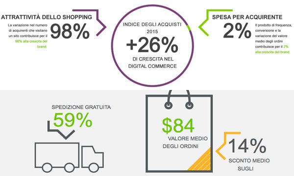 Negli ultimi tre mesi del 2015 il commercio digitale ha registrato un aumento del 26%: per quanto riguarda la crescita del brand, la variazione nel numero di acquirenti che hanno visitato un sito ha contribuito per il 98% (attrattiva), mentre il prodotto della frequenza, della conversione e del valore medio degli ordini per il 2% (spesa).
