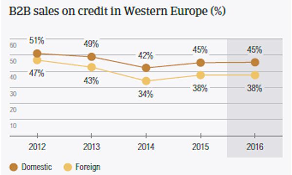 Italia e Grecia sono i Paesi con la maggiore incidenza di ritardi di pagamento su fatture commerciali sul mercato domestico: in media, quasi la metà del valore totale delle fatture commerciali in tali Paesi è risultata non pagato alla scadenza, un dato superiore del 10% rispetto alla media per l'Europa Occidentale. Per contro, gli intervistati nel Regno Unito hanno riferito la maggiore incidenza di ritardi di pagamenti da parte di clienti esteri: il 46,4% del valore totale delle vendite a credito delle aziende britanniche sui mercati esteri è risultato insoluto alla scadenza della fattura, ben al di sopra della media per l'Europa Occidentale (38,3%).
