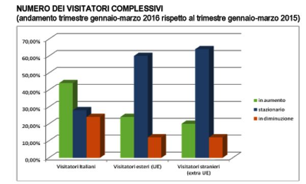 Lo spaccato della provenienza dei visitatori indica una crescita più significativa degli italiani, pari al +20%, seguiti dagli europei (saldo +12%) e da quelli provenienti dai Paesi extra UE che registrano un saldo positivo del +8%.