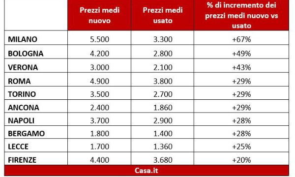 Uno studio di Casa.it rivela che il nuovo, rispetto all'usato in buone condizioni, può costare dall'8% al 110% in più. Milano (+67%), Bologna (+50%) e Verona (+43%) sono le città col divario maggiore. A Firenze la differenza è più contenuta (+20%)