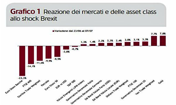 La sterlina ha perso molto terreno, in particolare contro il dollaro (arrivando ai minimi degli ultimi 30 anni), così come i mercati azionari europei. A guidare i ribassi sono stati i listini più fragili (Grecia, Italia, Spagna) e a livello settoriale i titoli finanziari. Impatti rilevanti si sono registrati anche nel reddito fisso, con un "flight to quality" che ha spinto ancora più in basso i rendimenti decennali dei Treasury americani al 1,445% e i Bund tedeschi al -0,127% e spinto di converso verso l'alto lo spread sui titoli governativi della periferia e sui corporate.