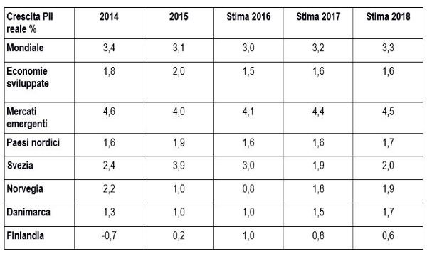 Le nuove previsioni economiche di Nordea stimano una crescita globale del 3,0% quest'anno, di circa il 3,2% nel 2017 e del 3,3% nel 2018.