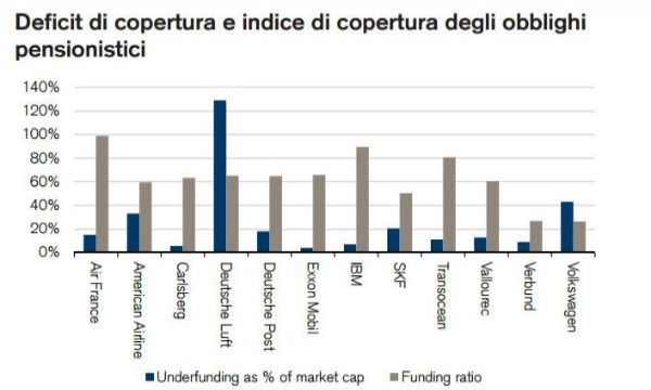 Sebbene la volatilità della copertura (attivi pensionistici al netto degli obblighi pensionistici) non sia interamente riflessa nel conto economico di un'azienda a causa delle norme contabili, comporta dei rischi per gli investitori. Il deficit pensionistico potrebbe determinare in futuro contributi pensionistici più elevati, ripercuotendosi dunque su redditività e flussi finanziari. Inoltre, potrebbe mettere a rischio la sostenibilità delle distribuzioni di dividendi e incidere negativamente sulla valutazione dei titoli. Abbiamo passato in rassegna il nostro universo di copertura per i titoli ipotizzando o un obbligo pensionistico con una copertura insufficiente (superiore al 5% della capitalizzazione di mercato) oppure un tasso di sconto superiore al 4% e un obbligo pensionistico con una copertura insufficiente. Queste aziende potrebbero finanziare i propri piani pensionistici o riportare un aumento delle spese pensionistiche in futuro.