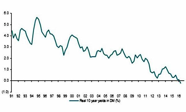 Almeno i rendimenti reali sono protagonisti di un trend ribassista da diversi anni (si veda il grafico) e hanno continuato a registrare un calo anche nel 2016. Questo fattore è molto favorevole al miglioramento delle condizioni finanziarie. A mio parere, questo trend strutturale ribassista non è ancora giunto ad una conclusione. Infatti, un livello dei tassi reali sempre più negativo è la condizione necessaria affinché si verifichi un aggiustamento al ribasso del rapporto debito pubblico/PIL nel lungo periodo. Questo supporterà una coordinata espansione fiscale nel lungo termine; tuttavia, a mio parere, gli investitori che sperano in una significativa reflazione fiscale entro il prossimo anno potrebbero restare molto delusi.