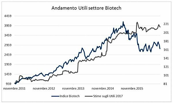 Come si vede dal grafico le stime sugli utili del settore biotech continuano ad aumentare mantenendo una crescita media annualizzata del 20%.