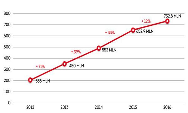 Nel 2016 il numero complessivo di transazioni segna un altro anno di crescita, le notifiche legate a conti corrente e carte di pagamento che hanno viaggiato sulle reti mobile italiane raggiungono un volume record pari a 732,4 milioni, con una percentuale di crescita del 12% rispetto al 2015 che registrava 653,6 milioni. Un trend che è proseguito in ascesa nel tempo nonostante la crisi economica, basta pensare che il dato complessivo annuale sulle transazioni è più che raddoppiato negli ultimi 5 anni, nel 2012 il numero complessivo di notifiche era circa 335 milioni.