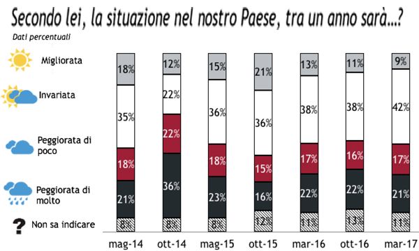L'Osservatorio registra una sostanziale stabilità del sentiment: rispetto a ottobre 2016, quando l'11% dichiarava di attendersi un miglioramento della congiuntura italiana nell'anno successivo, il dato oggi si attesta al 9%. Stabili i pessimisti, con il 17% che pensa a un lieve peggioramento, e il 21% che pensa a un peggioramento netto.