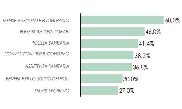 Il 67% delle imprese italiane fa welfare. E il 18,4% ha introdotto welfare negli ultimi dodici mesi. Il 37% delle aziende ritiene che le agevolazioni fiscali previste dalle nuove normative abbiano incentivato l'attivazione di piani di welfare aziendale, ma non in modo decisivo. La maggior parte delle aziende, infatti, ha avviato piani di welfare non solo per ridurre il costo del lavoro (70,6%), ma anche per migliorare il clima aziendale (81%), attrarre talenti (62,7%) e incrementare la produttività dei dipendenti (57,1%). In media i benefit più diffusi sono le mense aziendali e i buoni pasto (60%), la flessibilità degli orari (46%), le polizze sanitarie (41,4%), le convenzioni per il consumo (38,2%), l'assistenza sanitaria (36,8%) e i benefit per lo studio dei figli (30%).