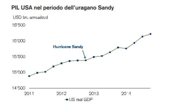 A giudicare dai passati eventi metereologici devastanti come gli uragani Sandy (2012) e Katrina (2005), gli effetti negativi sull'economia statunitense si dimostreranno temporanei. Katrina si tradusse principalmente in un netto calo della produzione industriale, che venne stato recuperato rapidamente. Nel trimestre in cui l'uragano Sandy provocò delle frane, il PIL USA ristagnò nel contesto di una dinamica economica certamente già debole, ma l'attività economica riaccelerò significativamente in seguito (si veda il grafico). Analogamente ci aspetteremmo che i recenti uragani Harvey e Irma abbiano un certo peso sul PIL del T3, a cui probabilmente farà seguito un rimbalzo nel T4, guidato da una domanda repressa dei consumi. Gli effetti economici positivi potrebbero quindi estendersi al prossimo anno grazie agli sforzi della ricostruzione, che si spalmeranno su un lungo periodo di tempo e che rappresentano in parte uno stimolo fiscale netto. La portata di quest'ultimo resta poco chiara in questa fase. USD 15,25 mia. in finanziamenti federali di emergenza sono già stati approvati dal Congresso, ma verranno stanziati probabilmente ulteriori fondi a livello sia federale che di singolo stato, il che potrebbe potenzialmente dare adito addirittura a lievi rischi al rialzo per le nostre previsioni di crescita del PIL 2018 del 2,0% anno su anno (yoy).