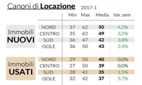 Il primo semestre 2017 attesta un range dei canoni di locazione invariato, rispetto al semestre scorso; eccezione fatta per gli immobili nuovi (costruiti nell'ultimo decennio/riqualificati) situati al Nord con una crescita del +4%. A emergere in questo scenario, oltre alla città prime di Genova (62 euro/mq/anno), è Milano (55 euro/mq/anno). A seguire, troviamo location prime come Roma (56 euro/mq/anno) e Catania (46 euro/mq/anno). Per quanto riguarda la locazione degli immobili usati, invece, i canoni medi più alti vengono riscontrati nella città prime come Firenze e Milano (50 euro/mq/anno), Roma (48 euro/mq/anno) e Genova (47 euro/mq/anno).