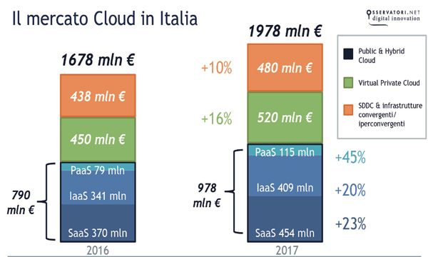 Nell'anno in corso, in Italia si è assistito a due principali atti di moto: da una parte il sostanziale consolidamento della parte di servizi applicativi fruiti in modalità SaaS, complice una diffusione massiccia sviluppata nel corso degli ultimi anni, dall'altra un arricchimento dell'utilizzo dei servizi infrastrutturali, che si stanno progressivamente spostando nella direzione delle piattaforme.