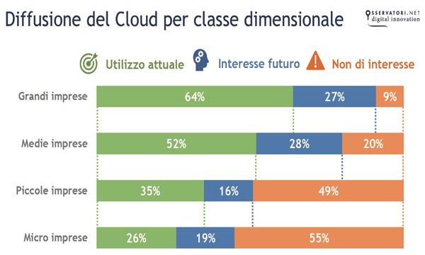 È quanto emerge dalla fotografia scattata dall'Osservatorio Cloud & ICT as a Service, giunto alla settima edizione e promosso dalla School of Management del Politecnico di Milano. La ricerca ha analizzato nel dettaglio l'evoluzione dell'offerta e i modelli di adozione di tale soluzione nelle aziende di grandi, medie e piccole dimensioni coinvolgendo oltre 1110 CIO e responsabili IT di imprese italiane.