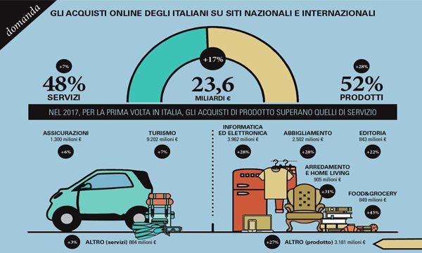 Tra i settori più performanti per il ritmo di crescita, troviamo il Food&Grocery (+43%) l'Arredamento e home living (+31%) con 900 milioni di euro ciascuno. Infine c'è l'Editoria con 840 milioni di euro (+22%). Gli acquisti in tutti gli altri comparti di prodotto valgono insieme 3,2 miliardi di euro nel 2017, in crescita del 27% rispetto al 2016. Qui si distingue il contributo dei Ricambi auto, con l'acquisto online pezzi di ricambio e pneumatici, del Beauty e dei Giocattoli. L'acquisto di prodotti genera circa 150 milioni di ordini all'anno con uno scontrino medio di 85 euro. Nei servizi, che valgono complessivamente 11,4 miliardi di euro, il Turismo e trasporti si conferma il primo comparto dell'eCommerce italiano con 9,2 miliardi. La crescita (+7%) è riconducibile agli acquisti di biglietti per i trasporti ferroviari e aerei, alla prenotazione di appartamenti e case vacanze (attraverso gli operatori della sharing economy) e alla prenotazione di camere di hotel. Gli acquisti online nelle Assicurazioni raggiungono quota 1,3 miliardi di euro (+6%) e rimangono focalizzati sulle RC Auto. Tra gli "Altri Servizi", che valgono circa 900 milioni di euro (+3%), rimangono importanti i contributi del Ticketing per eventi e delle Ricariche telefoniche. L'acquisto di servizi genera circa 50 milioni di ordini all'anno con uno scontrino medio di 235 euro.