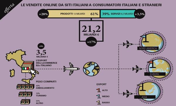 Il Turismo si conferma primo settore (9,2 miliardi, +7%) seguito da Informatica ed elettronica di Consumo (4 miliardi, +28%), e Abbigliamento (2,5 miliardi, +28%). Tra i settori emergenti i più importanti sono Arredamento e home living e Food&Grocery che insieme valgono quasi 1,8 miliardi di euro. Gli acquisti via smartphone crescono del 65% e superano quest'anno i 5,8 miliardi di euro.