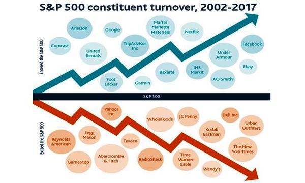La composizione dell'indice S&P 500 è in rapida evoluzione. Oggi, una tipica società quotata sull'S&P 500 sopravvive all'interno dell'indice mediamente per 18 anni, rispetto a una media di 61 anni nel 1958. Si stima che, entro il 2027, oltre il 50% degli attuali costituenti dell'indice saranno sostituiti. E non si tratta di aziende da poco: negli ultimi anni sono stati i pesi massimi industriali a essere cancellati dall'indice. Eastman Kodak nel 2010 ha ceduto il posto a una società di cloud computing, mentre il New York Times è stato scalzato nello stesso anno da Netflix.