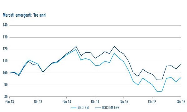 È quanto è emerso da uno studio del 2016 condotto da Cambridge Associates, che ha appurato che l'MSCI Emerging Markets ESG Index ha sovraperformato il più noto MSCI Emerging Markets Index nei primi tre anni dal lancio, e che più della metà della sovraperformance era ascrivibile a fattori ESG (cfr. grafico), tra cui emissioni di anidride carbonica, sicurezza dei prodotti ed etica aziendale.