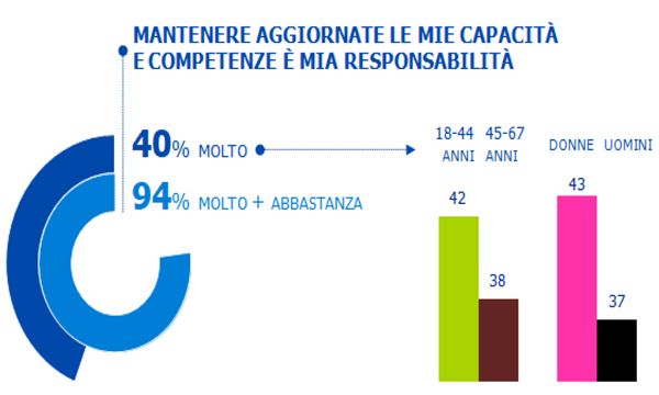 Nel dettaglio, secondo i risultati della ricerca, il 96% degli italiani punta sull'apprendimento continuo per aumentare le proprie possibilità di trovare o mantenere un posto di lavoro, contro il 90% della media globale, e il 94% sente che mantenere aggiornate le proprie capacità e competenze sia una propria responsabilità, tre punti in più della media globale. Una sensazione che spesso è avvertita più intensamente dai lavoratori giovani e di genere femminile (il 42% dei dipendenti fra 18 e 44 anni e il 43% delle donne), che dalle risorse con maggiore anzianità lavorativa e di genere maschile (il 38% degli over 45 e il 37% degli uomini).