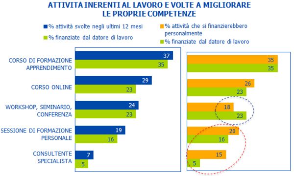 Nell'ultimo anno, il 71% dei lavoratori italiani ha svolto una o più attività formative. Un risultato in linea con la media globale (pari anch'essa al 71%), ma che presenta alcune differenze se si analizza il dettaglio delle singole attività di aggiornamento a cui partecipano i dipendenti. Gli italiani si dedicano principalmente a programmi di studio e formazione (37%), corsi online (29%) e workshop, seminari, conferenze (24%), mentre una percentuale più bassa partecipa a sessioni personali di formazione (19%) o si rivolge a un consulente specialista (7%). A livello globale, emerge la stessa preferenza per programmi di studio e formazione (37%), ma riscuotono maggior successo seminari, workshop e conferenze (36%), mentre sono meno gettonati i corsi online (24%) le sessioni personali di formazione (11%) e la consulenza di uno specialista (8%, comunque superiore di un punto al risultato italiano). Il 66% di queste attività sono finanziate dai datori di lavoro (dato in linea con la media globale), ma ben il 70% dei dipendenti (contro il 67% della media globale) è disposto a pagare per seguire percorsi di aggiornamento professionale; una propensione molto più diffusa nella fascia di età 18-44 (75%) che negli over 45 (62%).