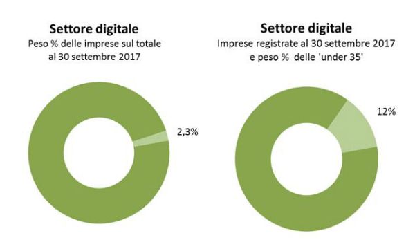 A fronte di questa mini-rappresentanza in termini numerici, il digitale mostra tuttavia di possedere una fortissima vitalità rispetto al resto dei settori: dall'inizio dell'anno, infatti, il comparto è cresciuto del 2,4%, quasi quattro volte più della media delle imprese italiane (0,6%). Il 12,5% di queste attività sono guidate da giovani con meno di 35 anni ma, se si guarda alle aperture di nuove imprese intervenute dall'inizio dell'anno, la spinta che viene dai giovani a questo settore così strategico è ben più significativa: delle 6.330 iscrizioni rilevate tra gennaio e settembre, il contributo degli 'under 35' sfiora il 35%.