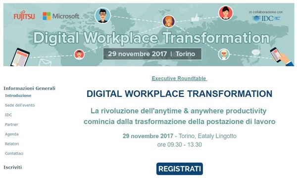 L'evoluzione del workplace aziendale guidata dalla digital transformation è al centro di un evento che Fujitsu e Microsoft in collaborazione con IDC organizzano il prossimo 29 novembre a Torino presso Eataly Lingotto.