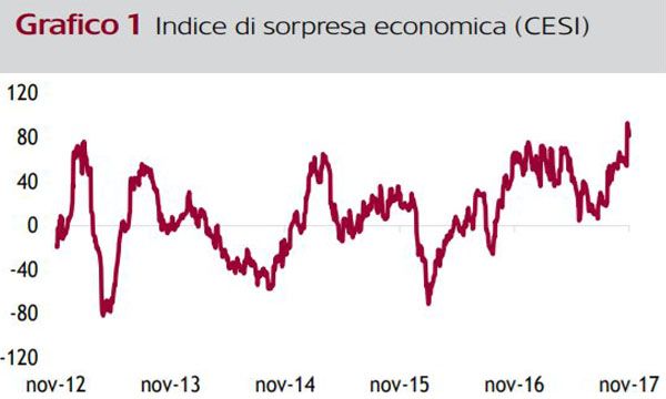 A livello macroeconomico, particolarmente sorprendenti sono stati i dati delle ultime settimane: gli indici di sorpresa economica (Grafico 1), che misurano quanto siano migliori o peggiori i dati rispetto alle previsioni, hanno raggiunto i livelli più alti da diversi anni, andando a sottolineare quanto stia migliorando l'economia dell'Eurozona. C'è da dire che, per quanto riguarda le prospettive, questa fase di crescita solida e distribuita potrebbe avere le potenzialità per dimostrarsi anche sostenibile: gli indici PMI manifatturiero delle principali aree geografiche, infatti, si attestano su livelli più alti non solo rispetto all'anno scorso, ma anche di un mese fa.